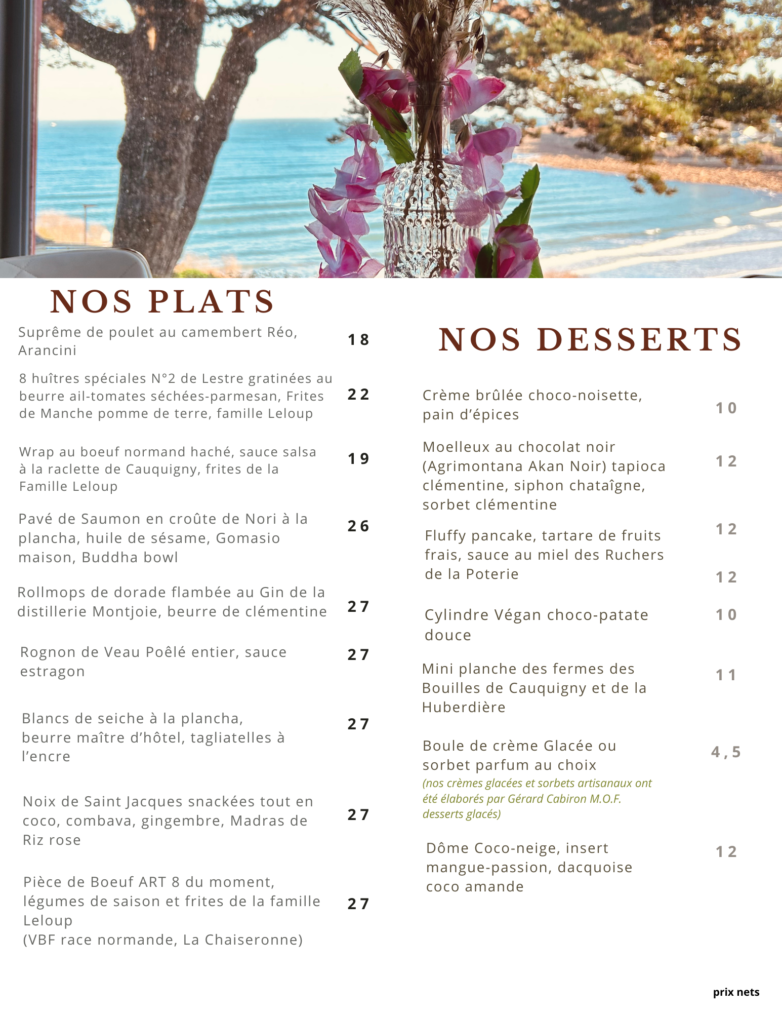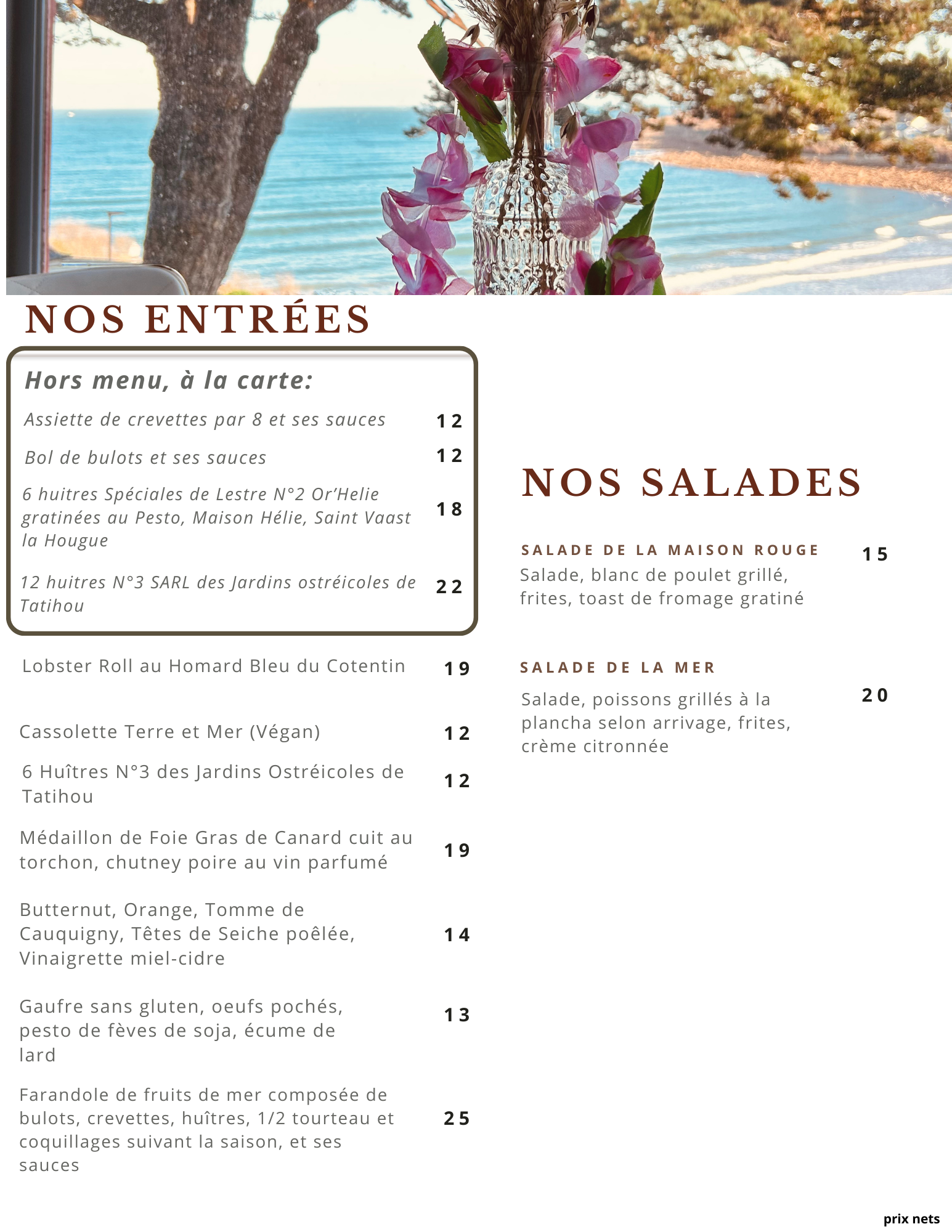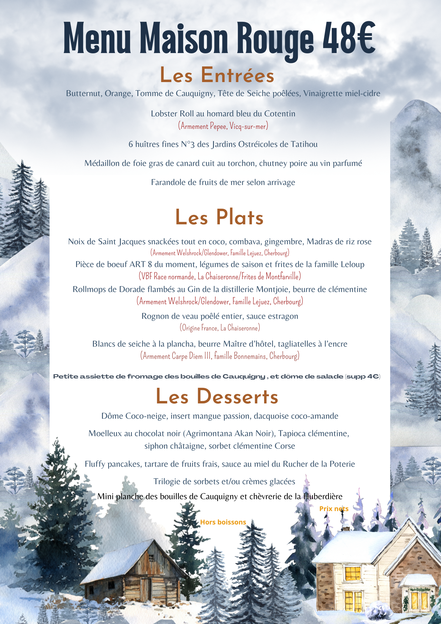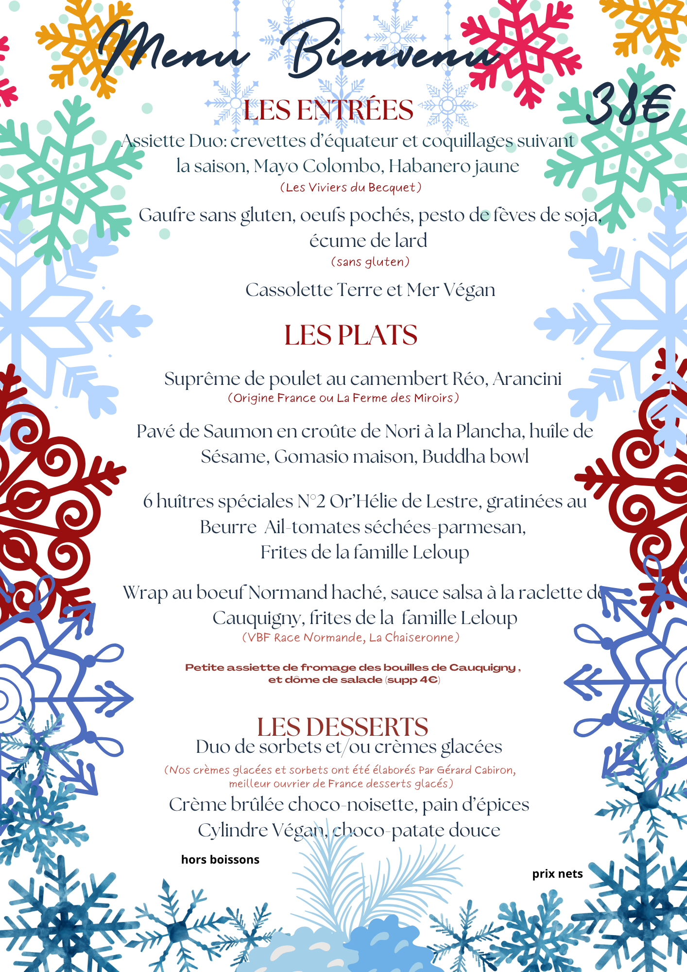 Nos cartes et menus hiver 2026 Réserver une table ; Carte des vins blancs Carte des vins rouges Nos formules midi en semaine Entrée=5€ plat= 14€ dessert=5€ Entrée + plat + dessert 20€
